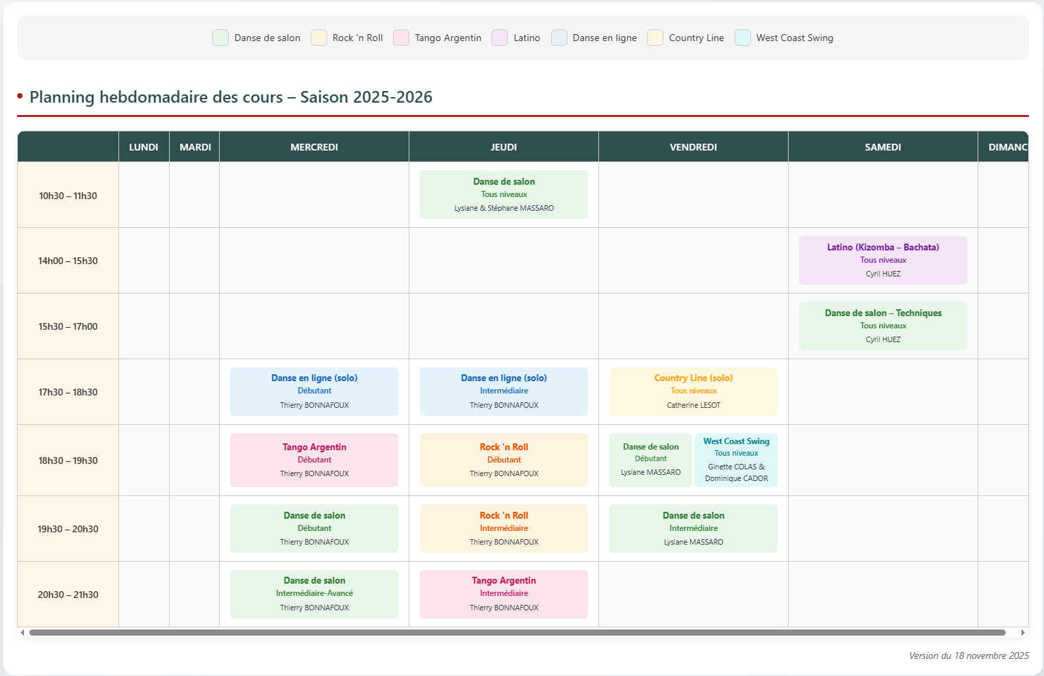 Consultez notre planning hebdomadaire pour connaître les horaires des cours de danse en duo et en solo.